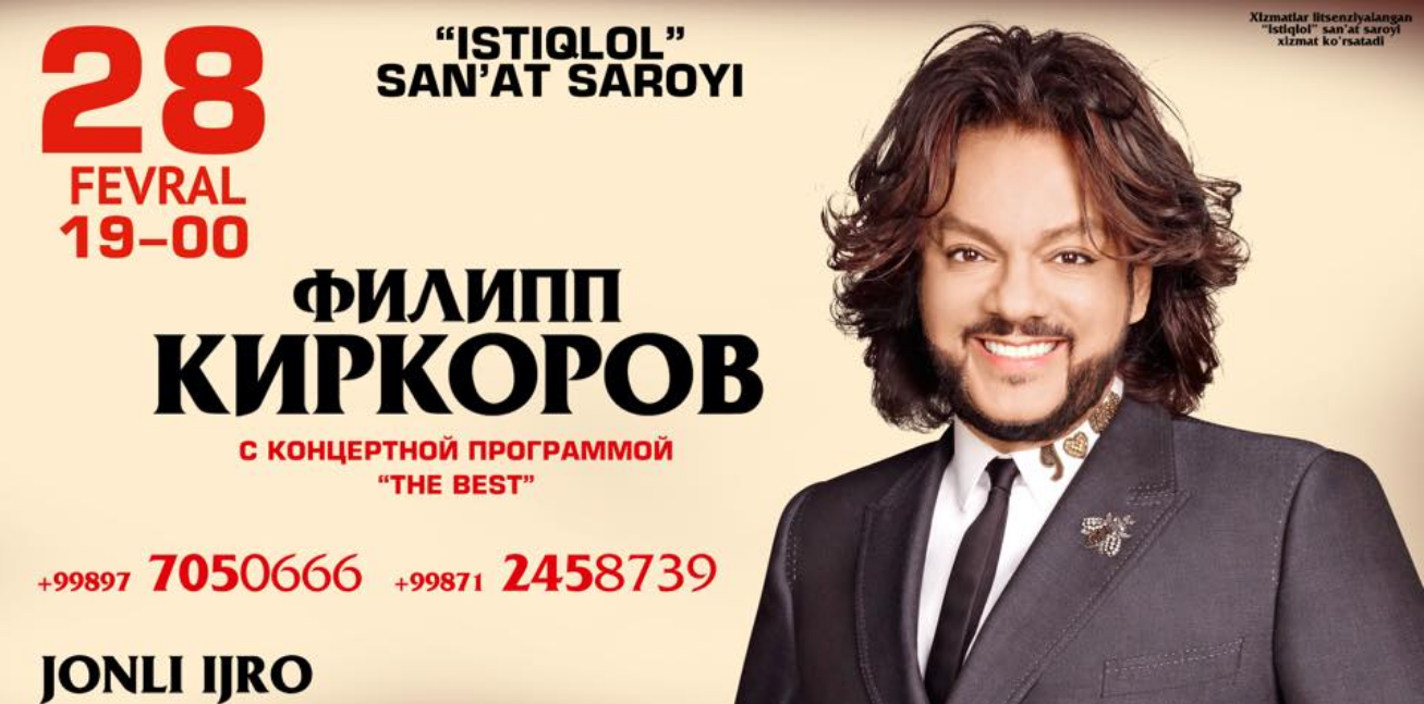 28 февраля в Ташкенте состоится выступление короля российской эстрады Филиппа Киркорова. Концерт пройдет во дворце «Истиклол» 28 февраля в 19-00. Зрителей ждет фееричное шоу с эффектными декорациями и зажигательными танцами.