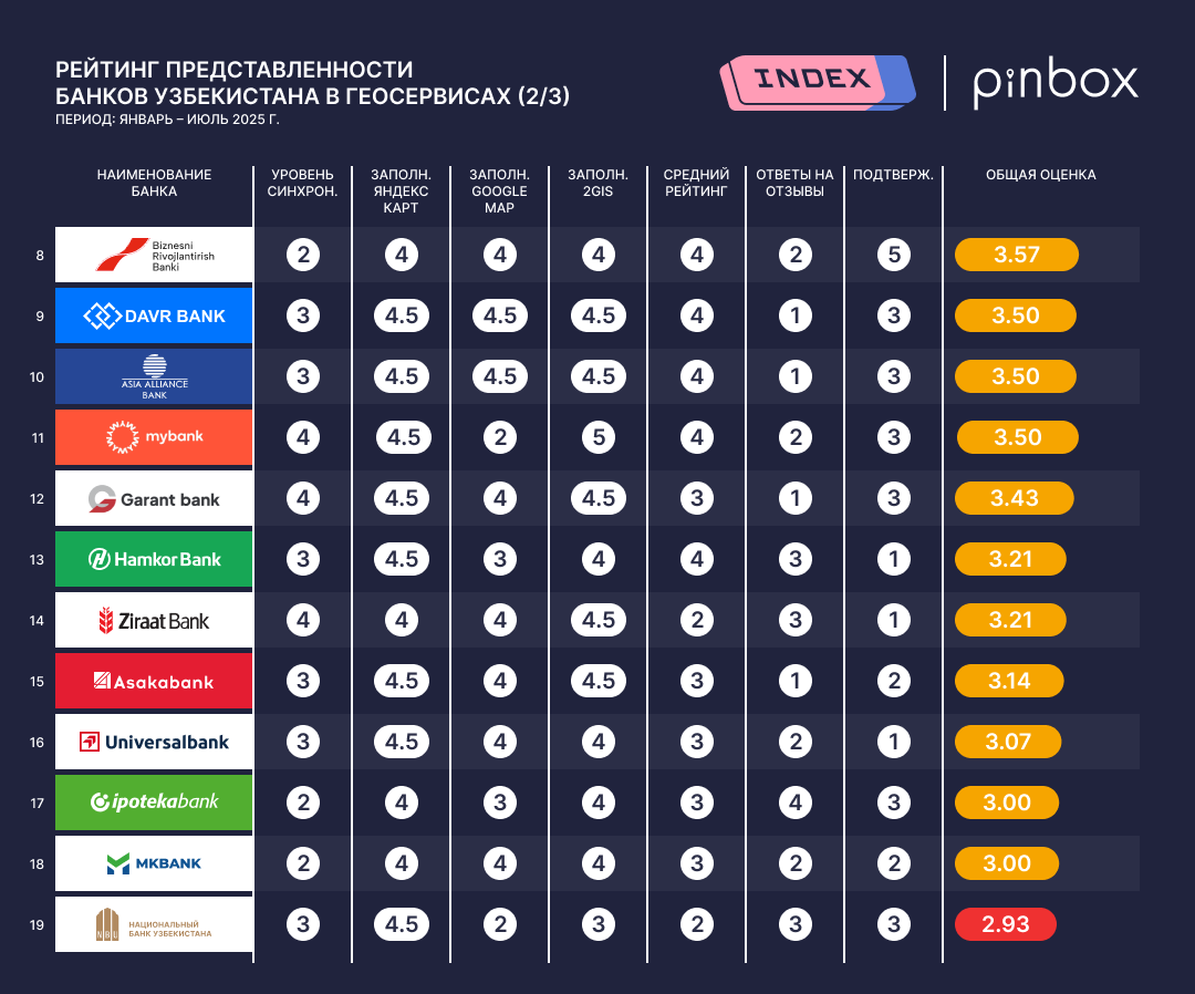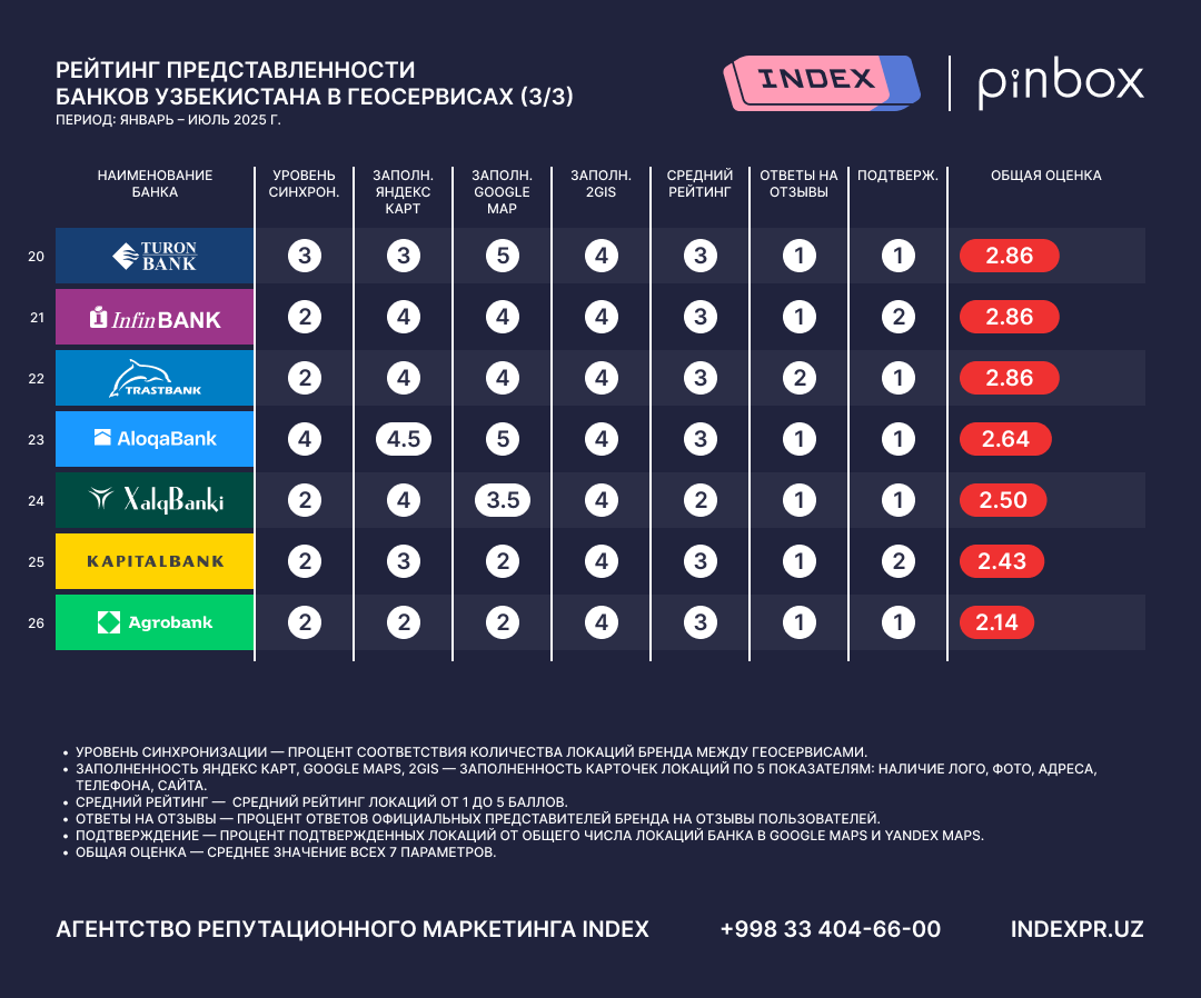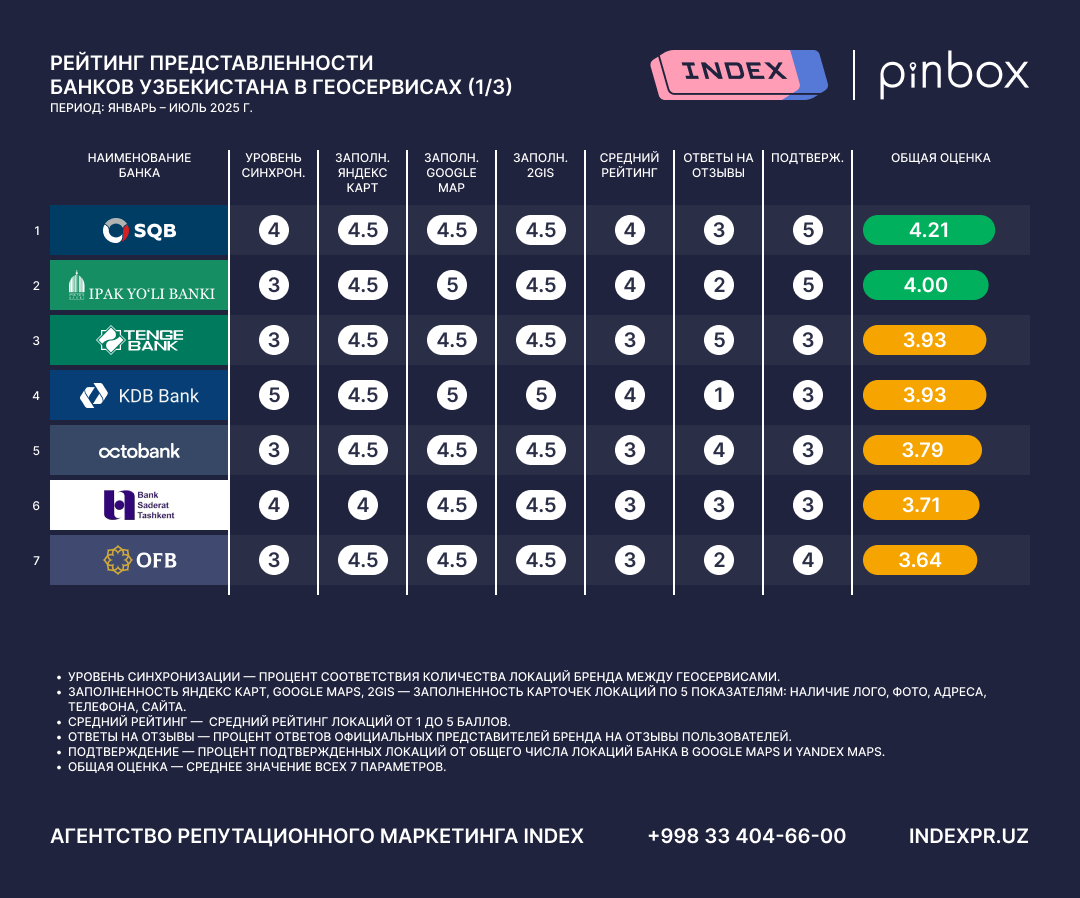 Агентство репутационного маркетинга Index и сервис геомаркетинга Pinbox подготовили рейтинг представленности банков Узбекистана в геосервисах по итогам первых семи месяцев 2025 года. Исследование проводилось по представленности локаций банков (офисы, филиалы, центры банковского обслуживания и другие) в основных геосервисах — Google Maps, Yandex Maps, 2GIS.
