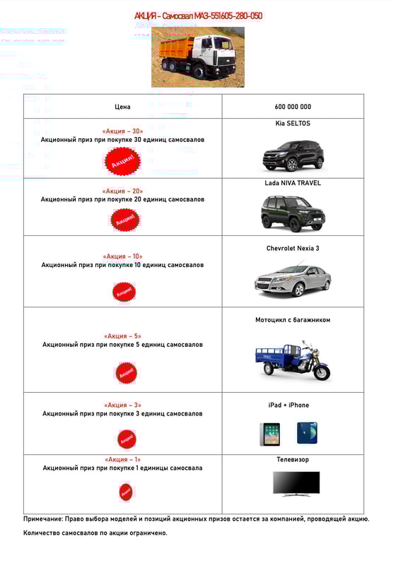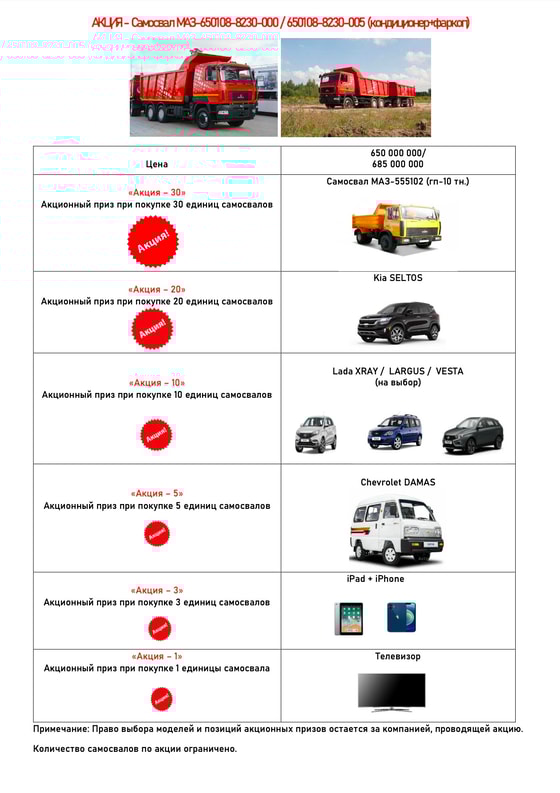 А самое главное, в честь празднования Курбан Хайита и своего пятилетия компания проводит беспрецедентную акцию «С МАЗом в лето!» с гарантированными призами. Право выбора моделей и позиций рекламных призов остается за компанией, проводящей акцию.