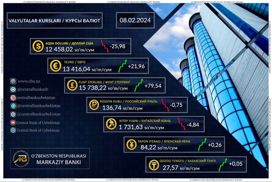 Курс доллара составил 12 458,02 сумов (-25,98), фунта 15 738,22 сумов (+79,54), евро 13 416,04 сумов (+21,96), а рубля 136,74 сумов (-0,75).