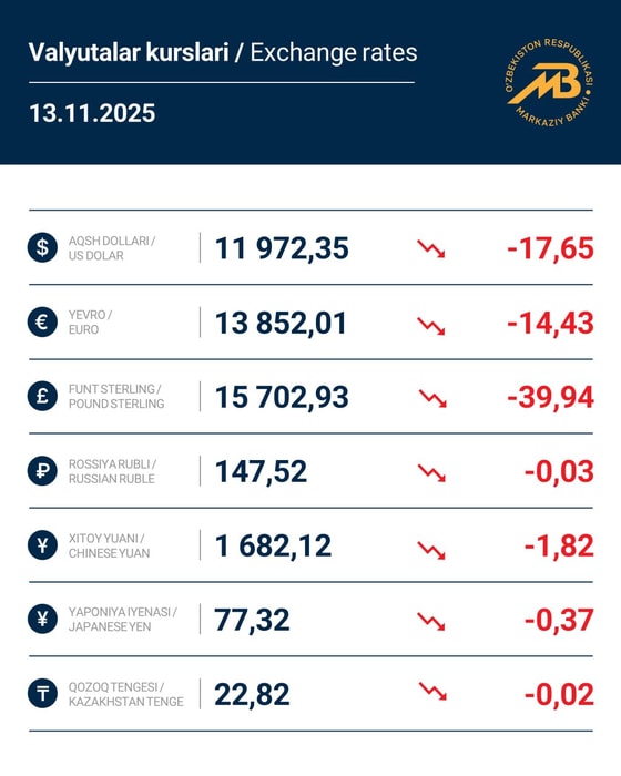 Курс доллара составил 11 972,35 сумов (-17,65), фунта 15 702,93 сумов (-39,94), евро 13 852,01 сумов (-14,43), а рубля 147,52 сумов (-0,03).