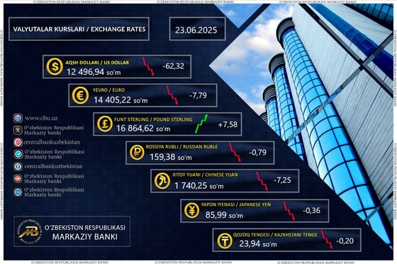 Курс доллара составил 12 496,94 сумов (-62,32), фунта 16 864,62 сумов (+7,58), евро 14 405,22 сумов (-7,79), а рубля 159,38 сумов (-0,79).