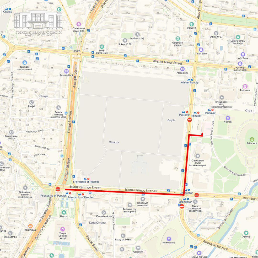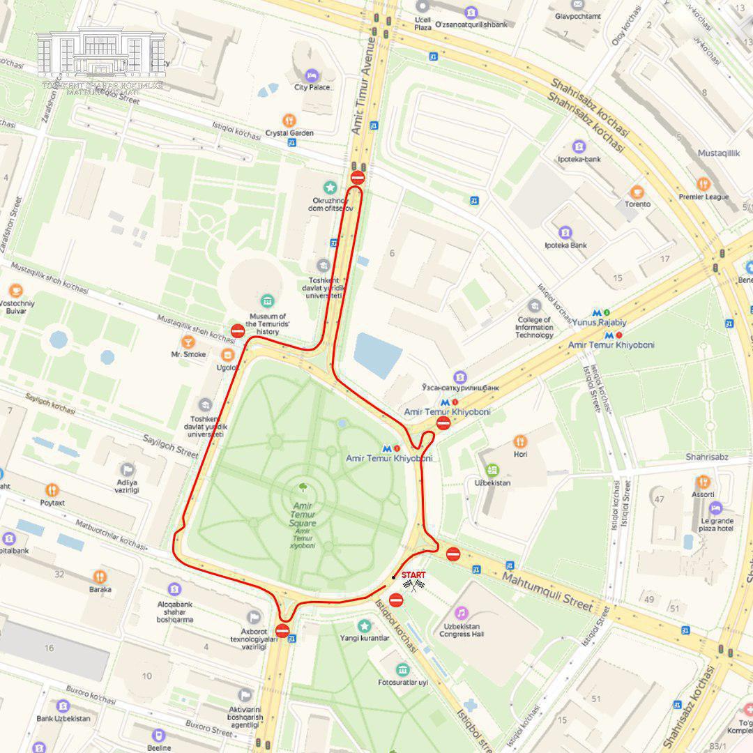 5 июля с 19:00 до 21:00 — круг Амира Темура и участок дороги по улице Амира Темура до пересечения с улицы Истиклол. Закрытие связано с проведением конного парада в честь Международного олимпийского дня.