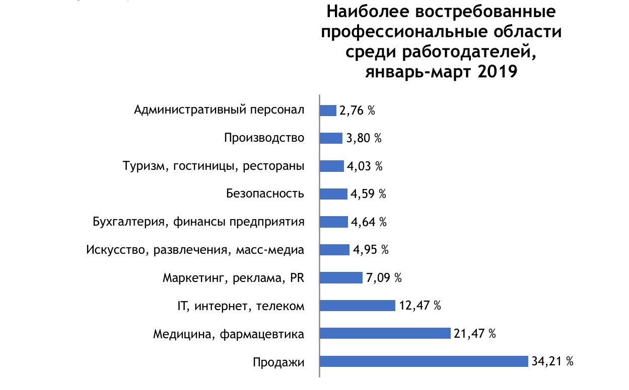 Лидирующую позицию в данном списке заняли продажи, на втором месте оказались медицина и фармацевтика, тройку лидеров замкнули информационные технологии, интернет и телеком. Наименее востребованными оказались туризм, гостиницы и рестораны. На 9-ом месте оказалось производство, а топ 10 замкнул административный персонал, говорится в отчете HeadHunter, оказавшимся в распоряжении Repost.