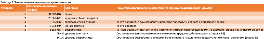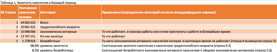 Уровень экономической активности населения за тот же период рос от 71,9% в 2015-м до 74,3% в 2018-м. Для расчетов возьмем данный показатель (до момента начала пандемии) на уровне 75%, или 75%*20 млн = 15 046 066 человек.