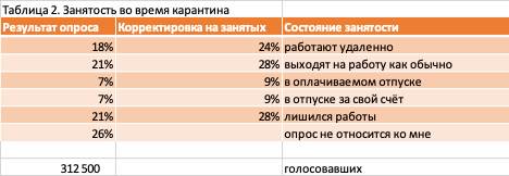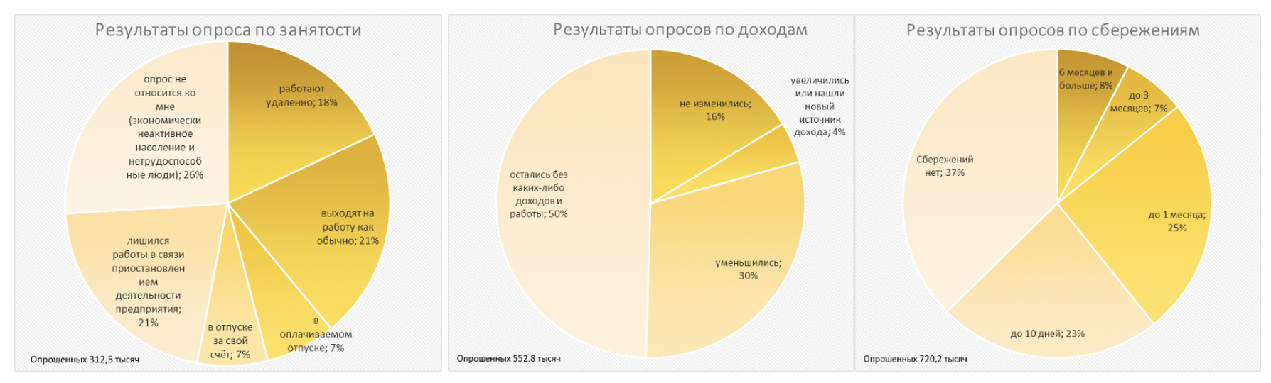 По результатам опросов по занятости, 21% опрошенных лишился работы, 7% находятся в неоплачиваемых отпусках, 46% сохранили доход и работу, 26% указали, что предмет опроса не относится к ним, что, скорее всего, означает, что эти люди не имели работы и до начала самоизоляции, т. е. это, скорее всего, экономически неактивное или нетрудоспособное население (домохозяйки, пенсионеры, инвалиды и т. д.).