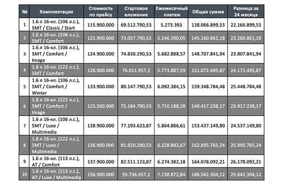 Таблица расчетов моделей LADA Vesta седан в лизинг с предоплатой 20% - на 13 месяцев