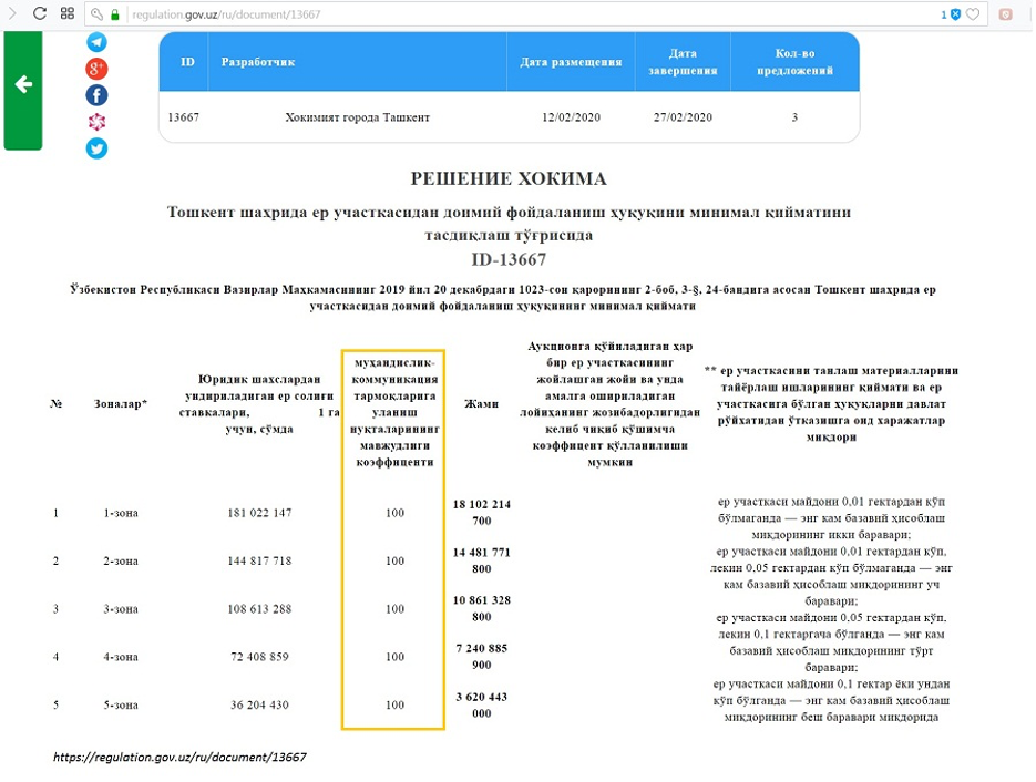 На портале обсуждения нормативно-правовых актов 12 февраля 2020 года был размещен проект решения хокима города Ташкента (ID-13667), в котором установлены ставки минимальной стоимости на приобретение права постоянного пользования свободными земельными участками в столице.