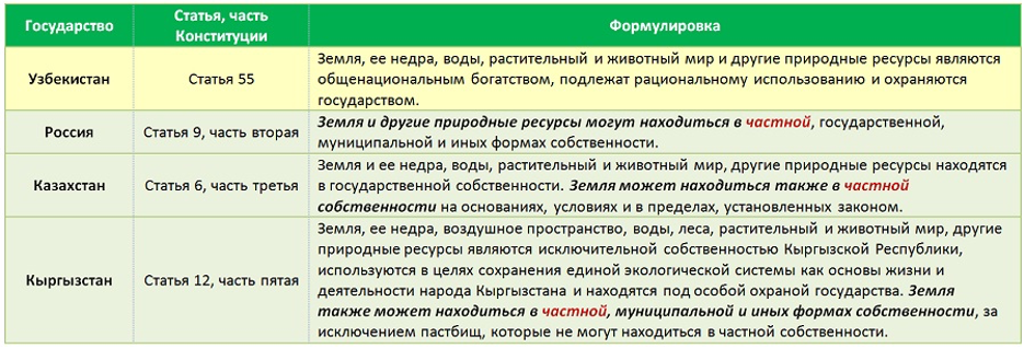«Земля является государственной собственностью — общенациональным богатством, подлежит рациональному использованию, охраняется государством и не подлежит купле-продаже, обмену, дарению, залогу за исключением случаев, установленных законодательными актами Республики Узбекистан».