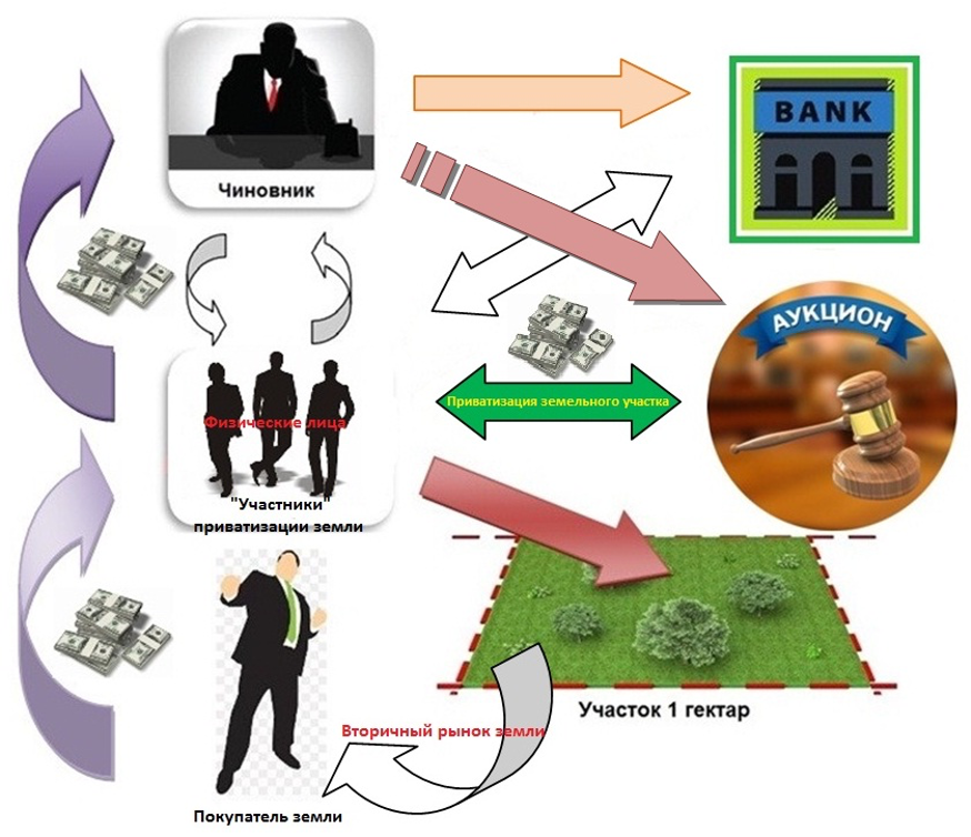 И где-то на этих уровнях цен в аукционных торгах победителями оказываются «участники» приватизации, близкие к чиновнику. Этот же чиновник способствует выделению банком кредита для выкупа земельного участка «участниками» приватизации.