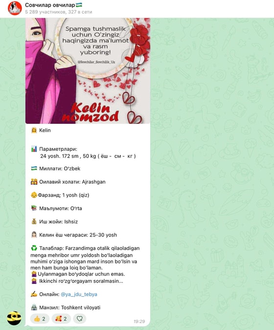 В местных каналах распространилась информация о группе, в которой пользователи из Узбекистана ищут себе невесток или женихов.