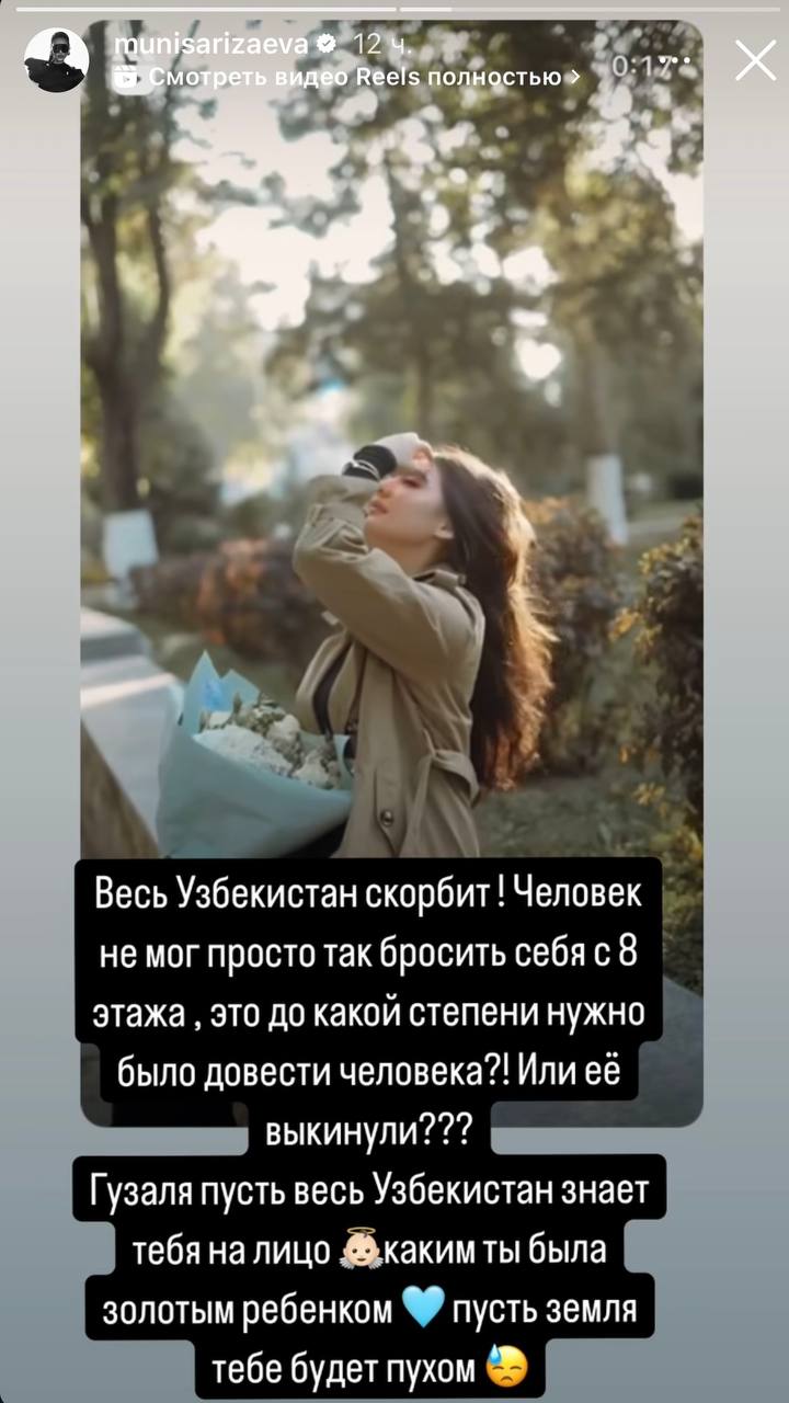 В сети появились многочисленные свидетельства, указывающие на то, что она могла стать жертвой домашнего насилия и преследования со стороны своего супруга и свекрови. Многие знакомые Гузали высказывают мнение, что её муж и свекровь могут быть причастны к её смерти или, по крайней мере, поспособствовали её самоубийству. По имеющимся данным, свёкор Гузали занимает высокую должность в системе здравоохранения Самарканда.