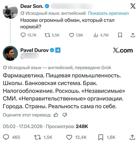 Основатель Telegram Павел Дуров поделился списком явлений, которые считает главными «обманами» современности. Свое мнение предприниматель высказал в соцсети X, отвечая на вопрос подписчика.