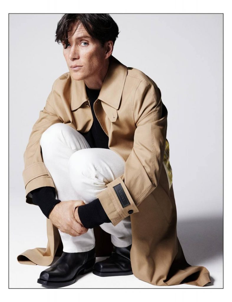 На новых кадрах Киллиан Мерфи позирует в базовых образах Versace: классическом черном жакете в сочетании с майкой-алкоголичкой, бежевом тренче с белыми джинсами и поло с брюками.