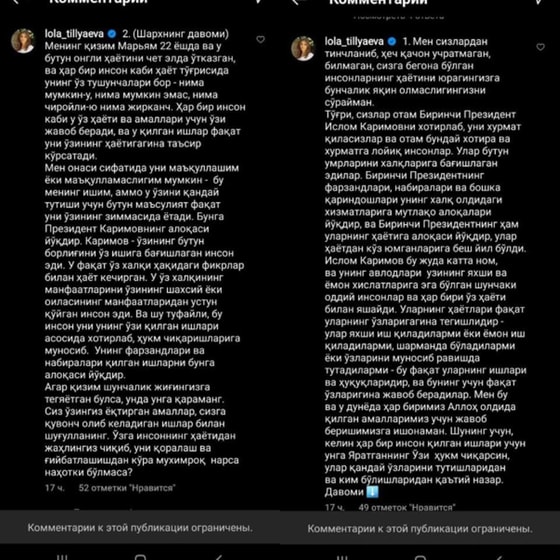 Опубликованное фото Марьям Тилляевой практически в обнаженном виде ее супругом Амираном Сардаровым, вызвало большой резонанс в сети. После многочисленного недовольства узбекистанцев, мама Марьям и дочь первого президента Лоля Тилляева прокомментировала ситуацию.