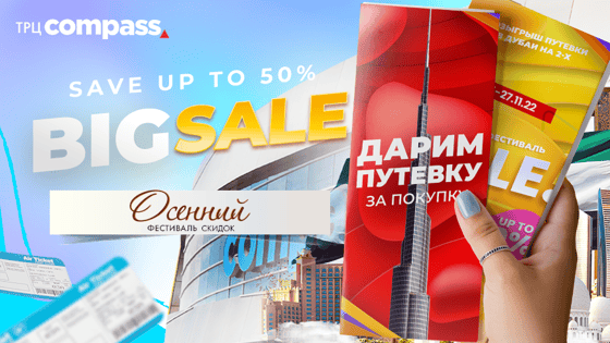 В конце ноября по всему миру проводятся распродажи и ТРЦ Compass не исключение. В ТРЦ проходит 3-дневный осенний фестиваль скидок, на котором бренды, представленные в ТРЦ, дарят выгодные предложения. Вас ждут различные акции, предложения и скидки до 90%. Но ТРЦ Compass решил порадовать вас не только скидками. Закупившись в магазинах ТРЦ, вы можете выиграть путешествие в Дубай на двоих в очаровательный бархатный сезон. Условия розыгрыша: