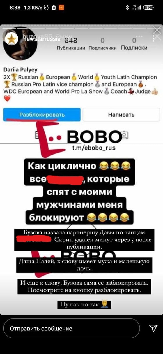 Недавно Бузова обнаружила, что находится в черном списке у Дарьи Палей, которая была партнершей Давы в шоу «Танцы со звездами». Правда, интересно, зачем Ольге вообще проверять Instagram Даши.