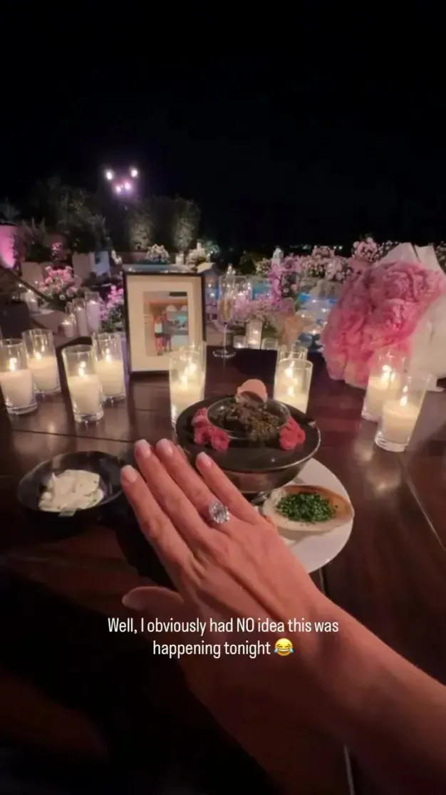 «Ты и я навсегда», — подписала видео спортсменка. В сторис она также продемонстрировала помолвочное кольцо с крупным бриллиантом и с юмором заметила, что «конечно же, понятия не имела о том, что произойдет сегодня вечером», намекая на свой идеальный маникюр.