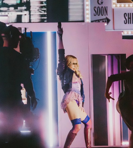 Для возвращения певица выбрала яркий и откровенный образ: лиловый топ в бельевом стиле, корсет, длинные перчатки, кружевные чулки и ботфорты. Примечательно, что похожий наряд она уже надевала во время своего выступления на фестивале в 2006 году.
