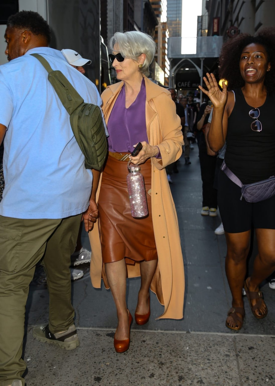 Легендарная Миранда Пристли возвращается на экраны — Мэрил Стрип была замечена на съемочной площадке в образе строгого редактора модного журнала Runway. Актриса предстала в элегантном ансамбле: бежевое пальто, фиолетовая блузка и кожаная юбка-карандаш — все в духе иконического стиля героини, покорившей миллионы зрителей.