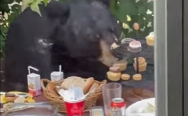 В какой-то момент черный медведь вышел из леса и подошел к столу. Затем он начал быстро кушать кексы. Неожиданный гость угостился сладостями и ушел с испачканной кремом мордой.