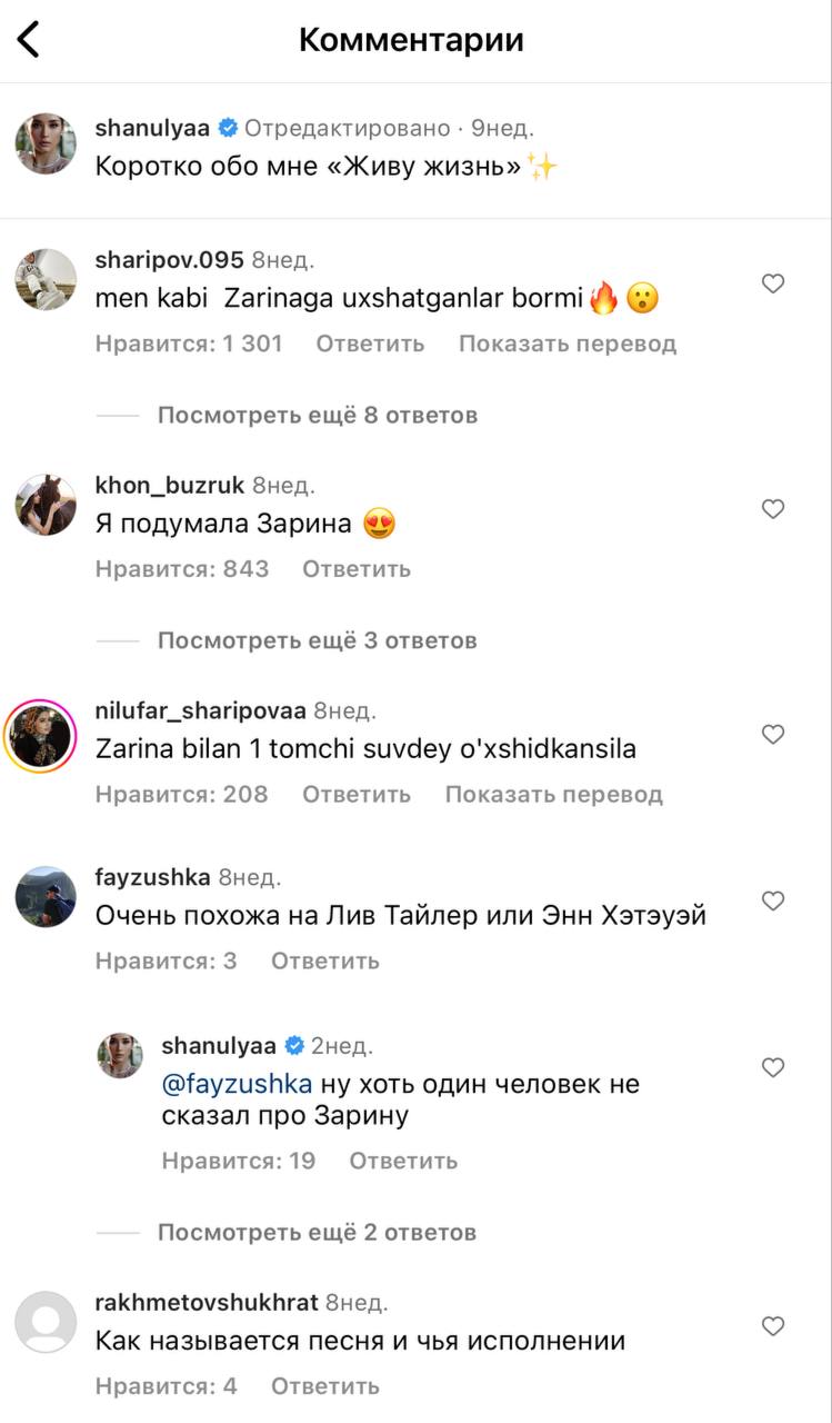 Поклонники узбекской актриса Зарины Низомуддиновой поделились необычной информацией. Им удалось найти в Instagram девушку из Ташкента под ником @shanulyaa, которая поразительно похожа на артистку.