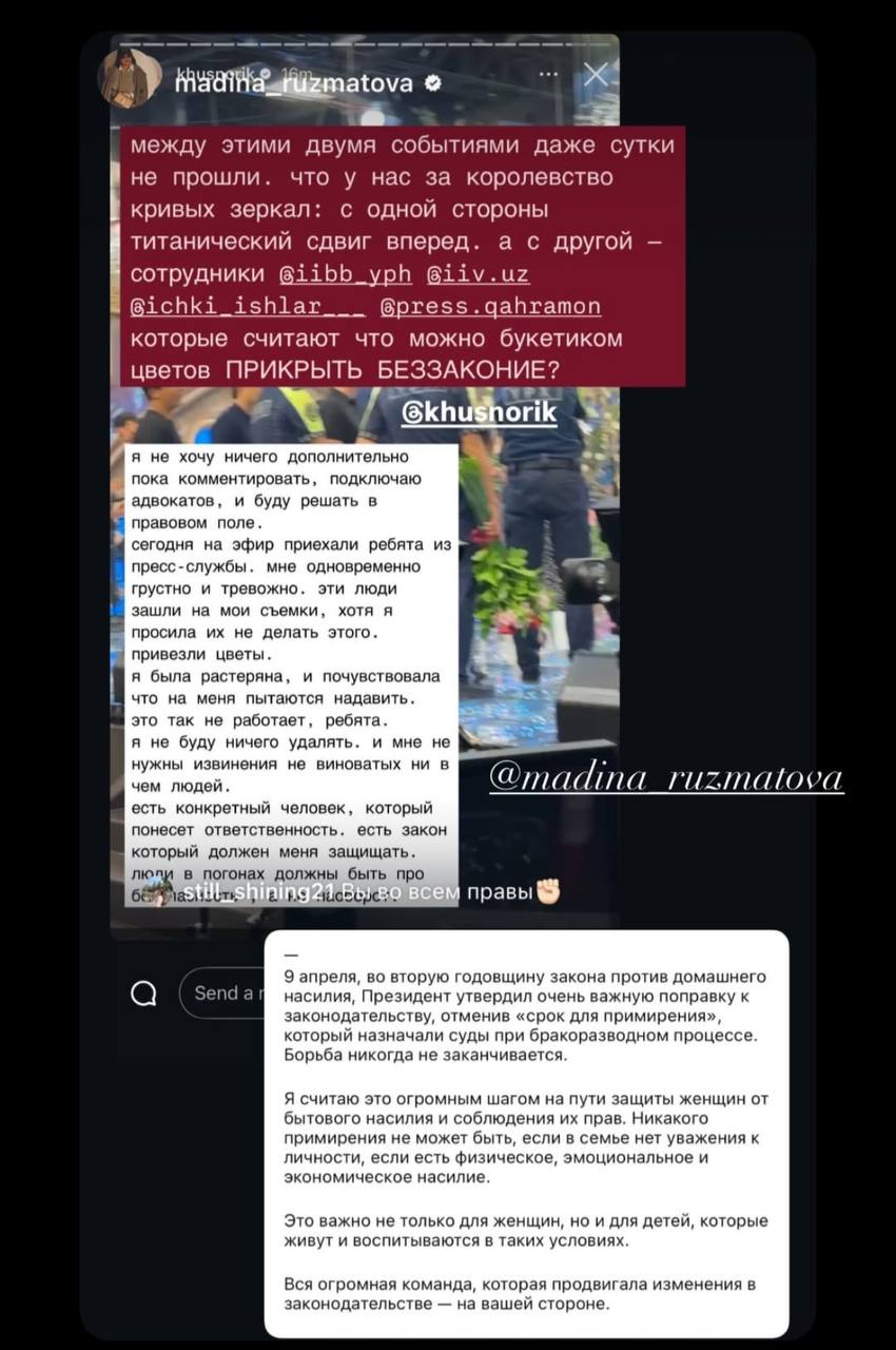 Об инциденте Хуснора Шадиева эмоционально рассказала в своем Instagram.