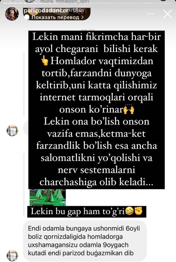 После этого, Паризода заявила, что каждая женщина должна знать свои границы. По ее словам, многим может показаться, что рожать и воспитывать детей легко, но это намного сложнее, чем показывают в интернете.