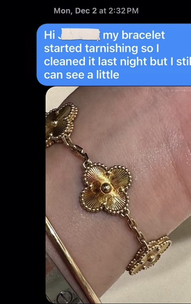 Моника обратилась в официальный бутик Van Cleef, где ей предложили провести профессиональную чистку. Однако после процедуры внешний вид изделия не изменился. Тогда сотрудники магазина посоветовали… купить новый элемент браслета за отдельную плату.