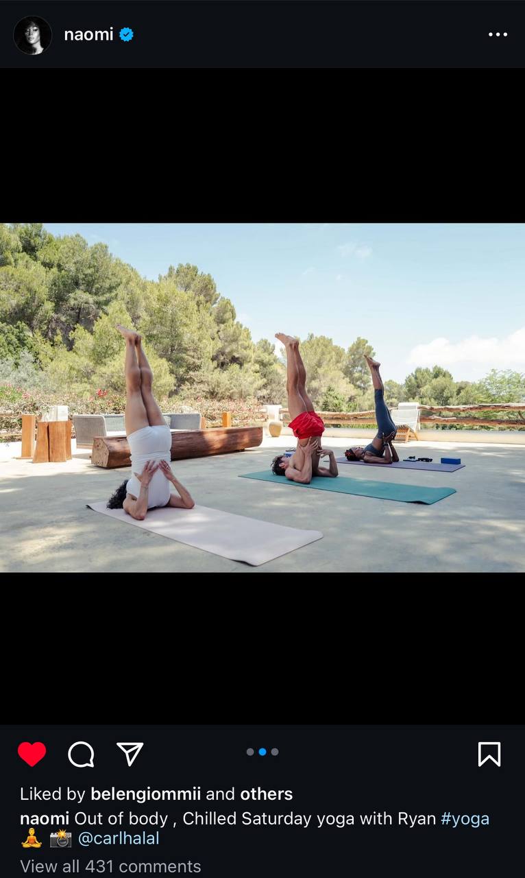 Мама двоих детей опубликовала на своей страничке в Instagram фото, на котором занимается йогой в компании испанского актера Джона Кортахарены и звезды «Форсажа» Мишель Родригес. Наоми выполнила несколько асан, завершив упражнения стойкой на голове.