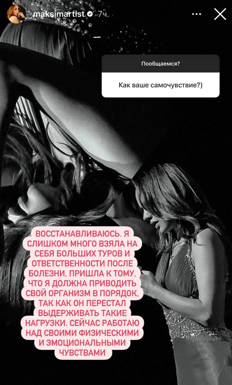 МакSим рассказала о своем восстановлении и добавила, что скорее всего концерты продолжатся уже с октября этого года.