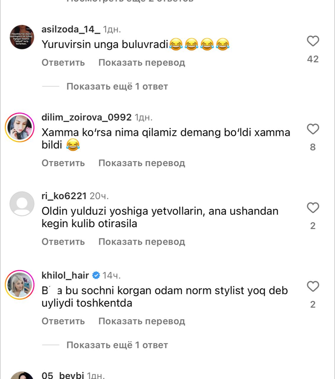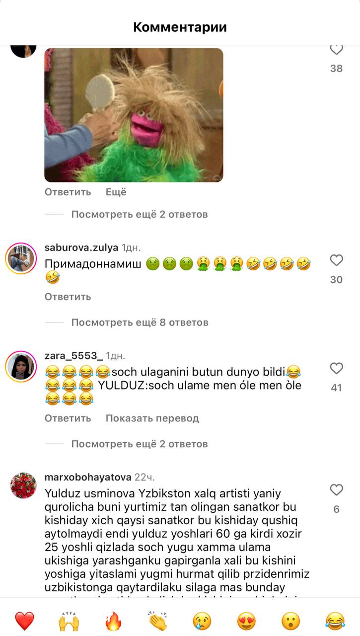 «Как вы можете позволить себе ходить с подобной прической?», «Смотря на ваши волосы, люди подумают, что в Ташкенте нет нормальных мастеров», «Примадонне стоит сменить мастера», – написали пользователи.