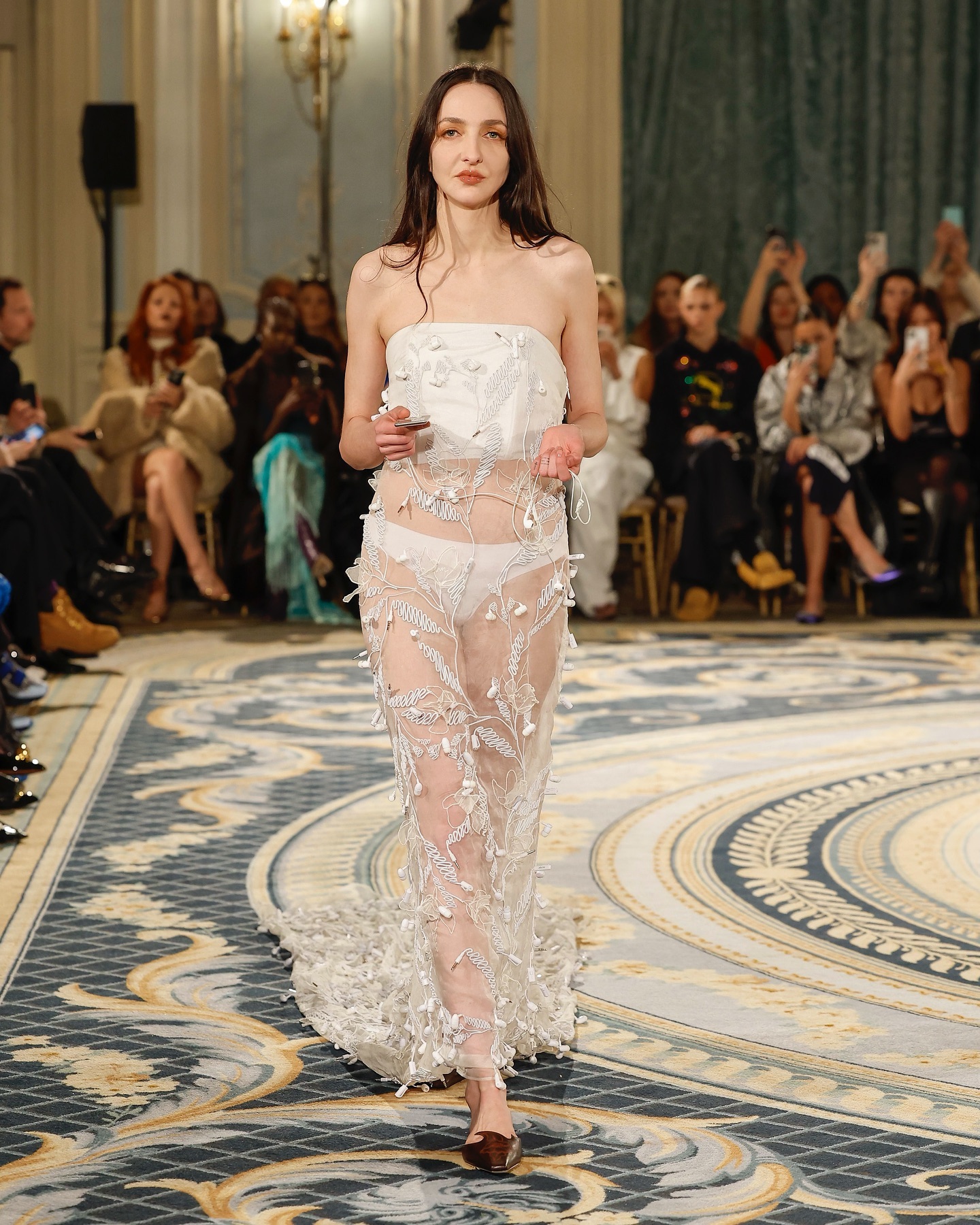 Недавно на смену дорогим полноразмерным наушникам пришли старые добрые гарнитуры с проводом. На это намекают сразу два модных дома на Неделе моды в Лондоне. На шоу бренда Conner Ives модель предстала в свадебном платье, расшитом белыми наушниками-вкладышами, и с плеером в руках.