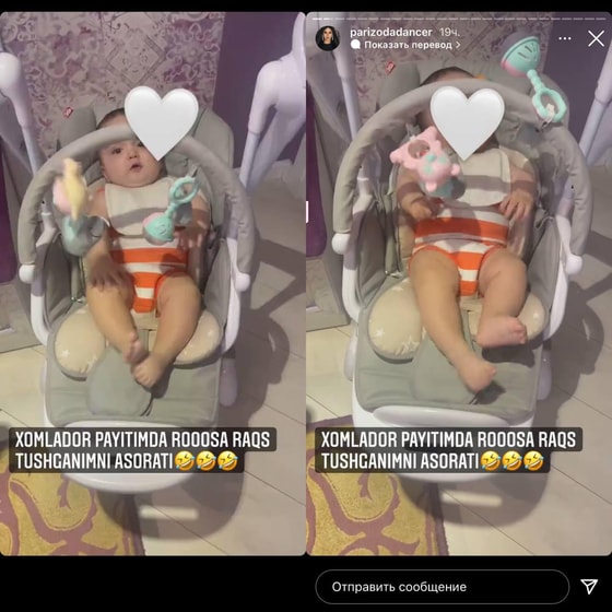 На днях популярная узбекская танцовщица Паризода поделилась видео на своей страничке Instagram, в котором показала своего младшего сына на кресле качалке. Малыш активно двигался под узбекскую музыку. Чтобы пройти мимо сглаза, артистка скрыла лицо малыша смайликом в виде белого сердечка. Однако, смайлик съехал, чего по всей видимости не заметила сама Паризода.