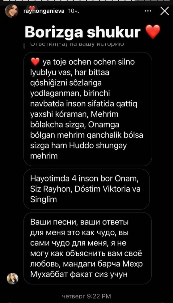 По словам поклонницы, как она проявляет любовь и заботу к своей матери, точно так же проявляет ее и к Райхон. Певица не смогла оставить без ответа такое признание и поблагодарила подписчицу, сказав, как хорошо, что у нее есть такие слушатели.