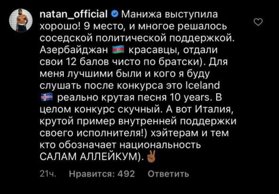 Российский рэпер и артист лейбла Black Star Натан под постом Bloknot.ru в Instagram решил написать слова поддержки участнице «Евровидения 2021» Маниже и похвалил других участников конкурса.