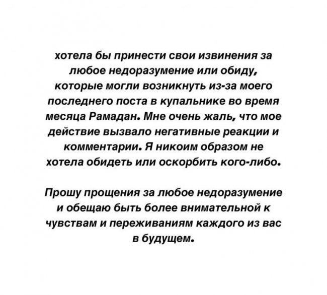 По мнению комментаторов, она не должна была делиться подобным контентом в месяц Рамадан. Знаменитость уже удалила видео и извинилась перед подписчиками.