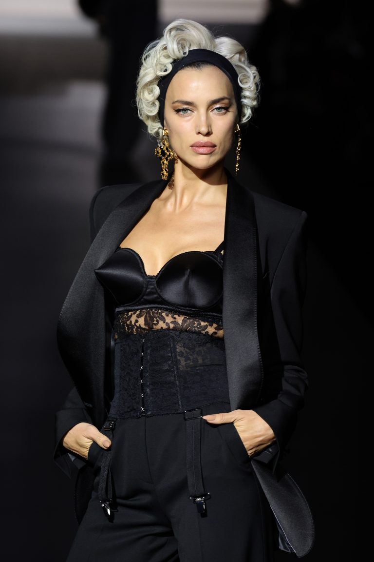 Супермодель прошлась по подиуму в Милане, облаченная в культовые белые локоны и конусный бюстгальтер. В свои 38 лет Ирина удачно сочетала экстравагантный элемент наряда с элегантным черным блейзером, брюками и золотыми серьгами-крестами. Темные волосы были скрыты под коротким светлым париком, напоминающим стиль певицы из 90-х.