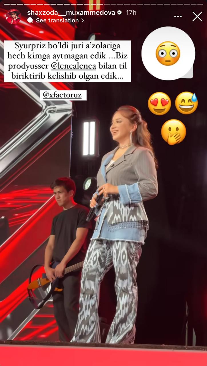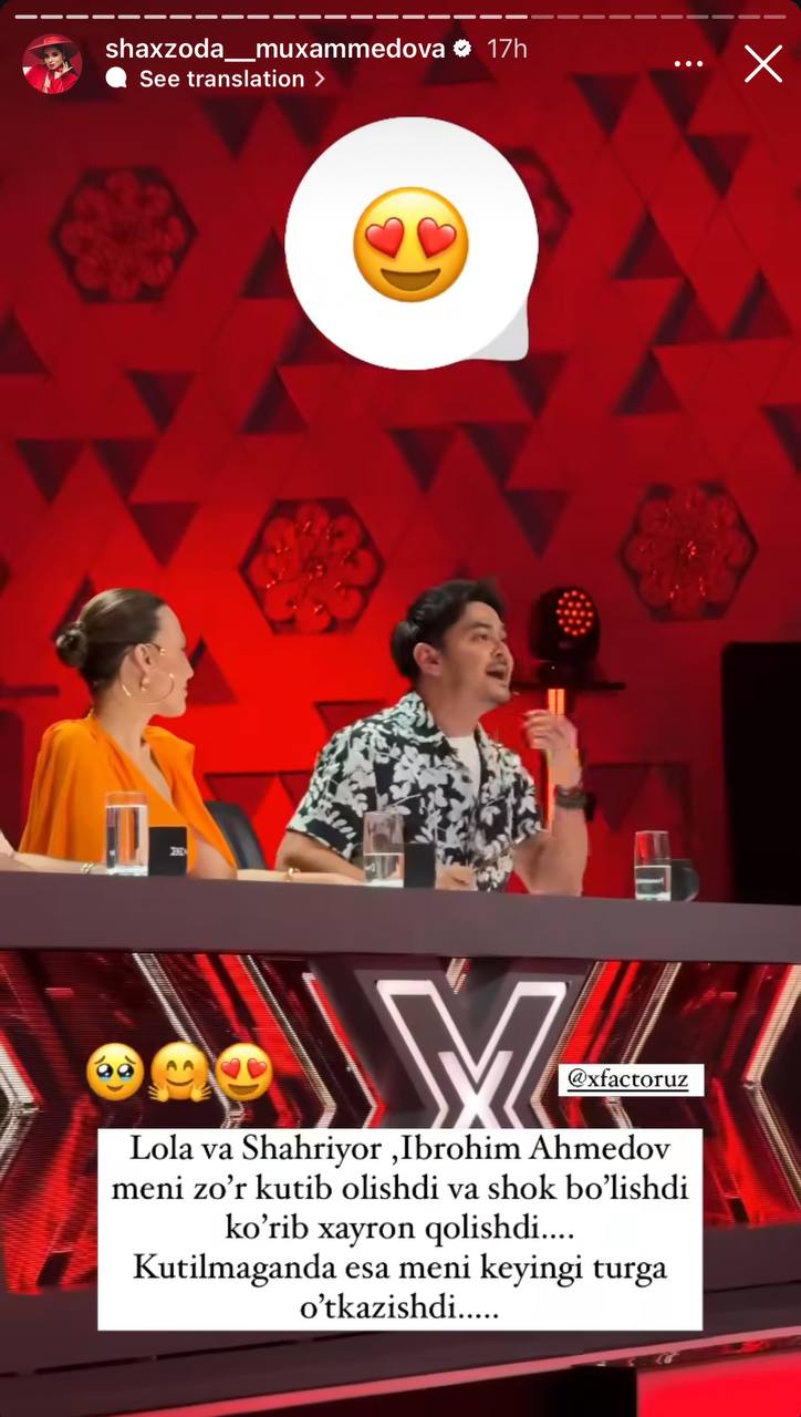 Шахзода исполнила песню и прошла в следующий отборочный тур. По ее словам она очень сильно волновалась волновалась перед выступлением, чтобы спеть вживую для жюри, так как члены жюри являются знакомыми для дизайнера.