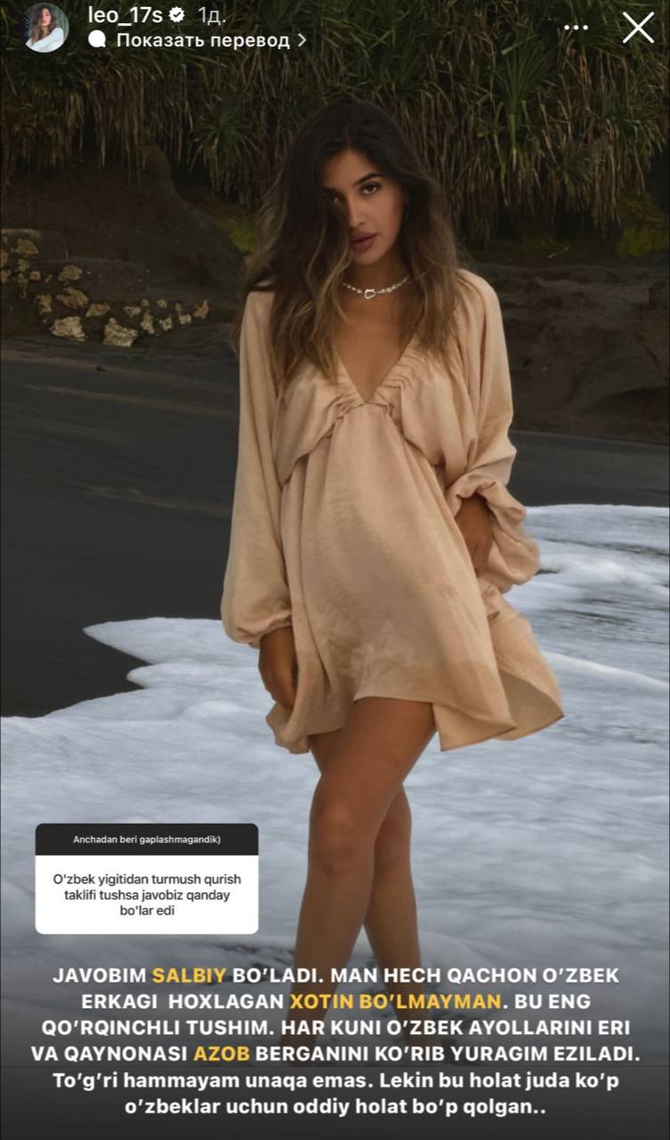 «Мой ответ будет отрицательный. Я никогда не буду той женой, которую хочет узбекский мужчина. Это мой страшный кошмар. Я каждый день вижу женщин, страдающих от их мужей и тещ. Это разбивает мое сердце. Конечно, не у всех одинаковая ситуация, но она довольно популярна»