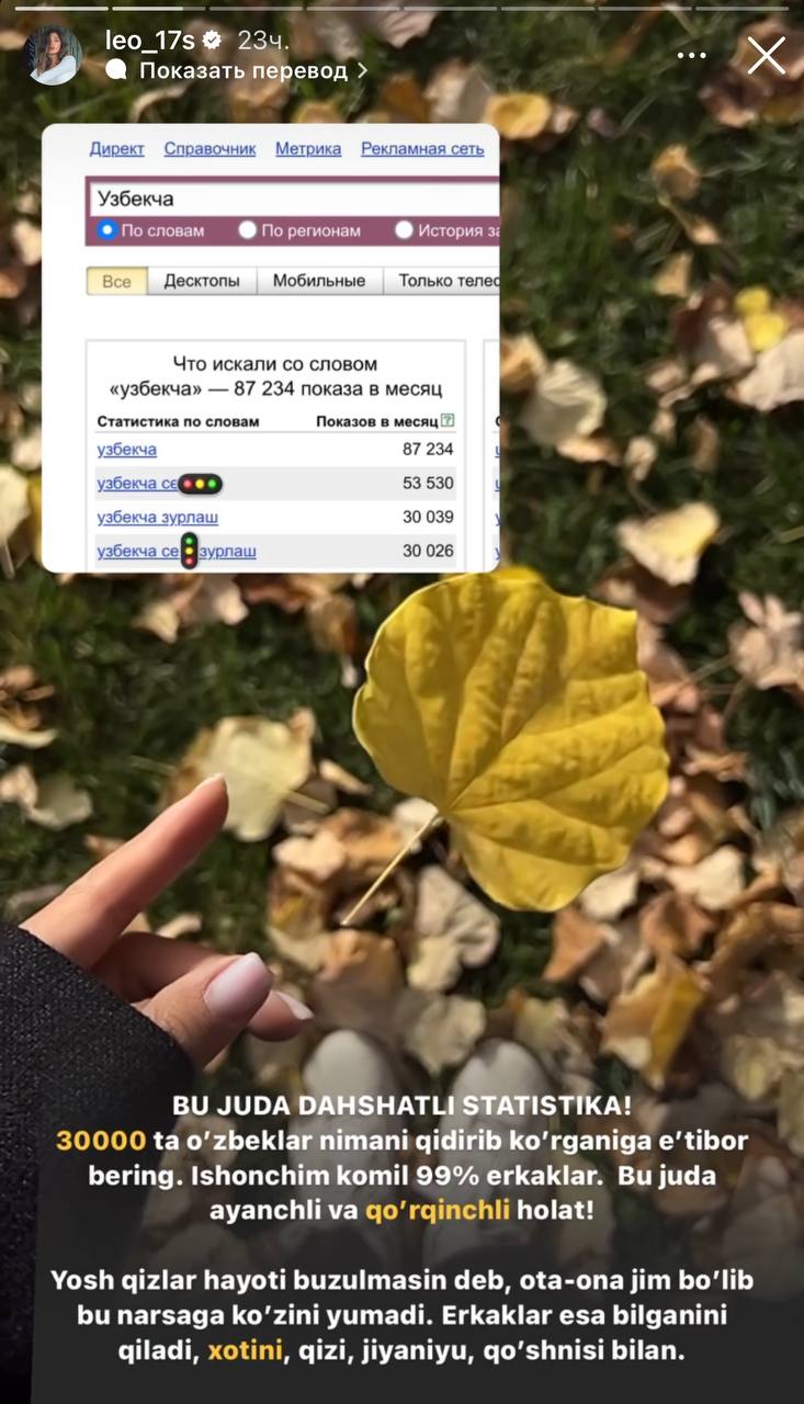 Далее девушка опубликовала статистику того, что чаще всего гуглят в Узбекистане. Она также показала ответы ее подписчиц, которые согласились с ее мнением, когда как мужчины начали писать гневные комментарии.
