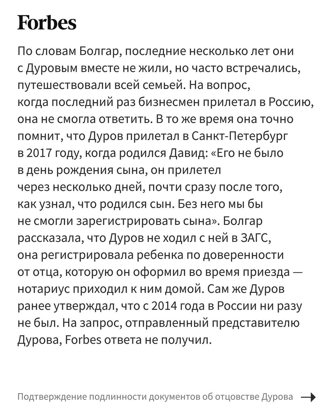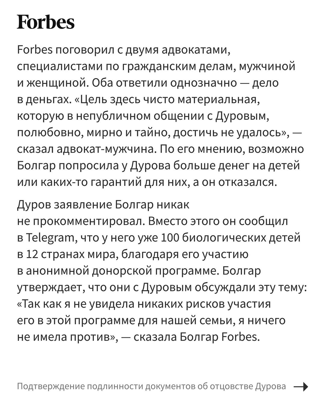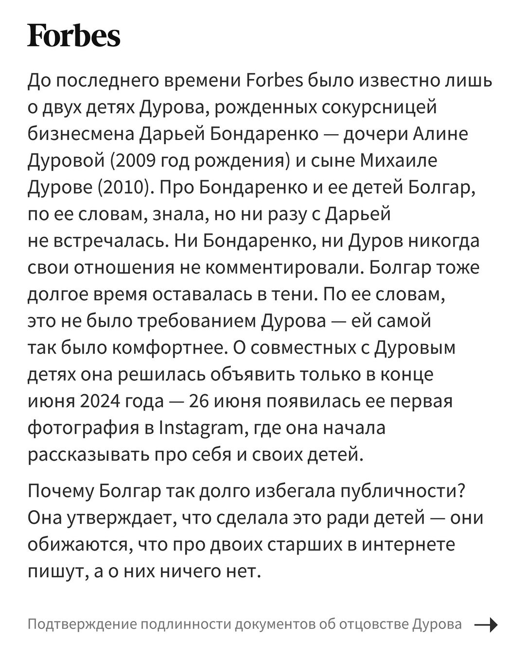 23 июля 2023 года Ирина Болгар, проживающая в Швейцарии, обратилась в редакцию Forbes с просьбой внести изменения в рейтинг миллиардеров. Она утверждает, что количество детей основателя Telegram Павла Дурова следует изменить с двух до пяти. По словам Болгар, она является матерью троих младших детей Дурова.