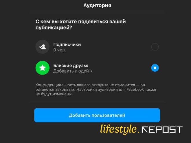 На снимке можно увидеть, что теперь перед публикацией есть возможность выбрать определенных пользователей в разделе: «Аудитория». Это позволит делиться своей фотографией среди избранного списка подписчиков.