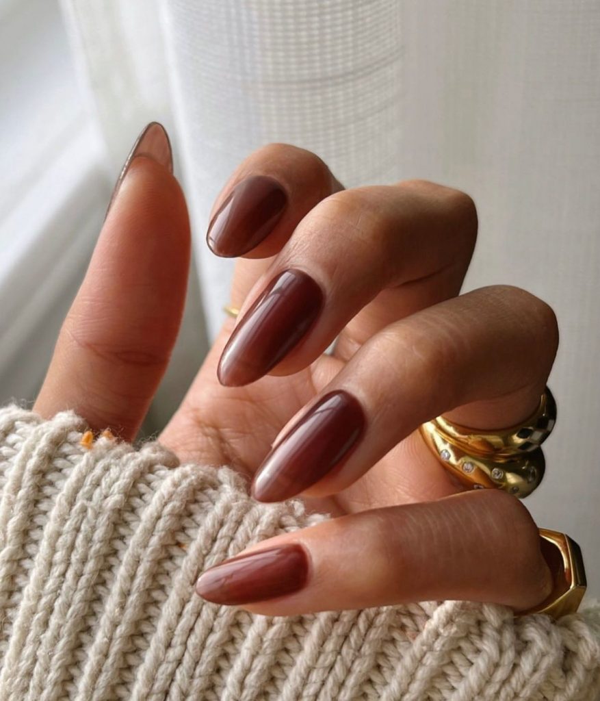 Цвет является универсальным – он подходит ко всему и создает уютное осеннее настроение. В последнее время девушки отдают предпочтение каштановому маникюру. В отличие от классического коричневого оттенок каштана более теплый, иногда карамельный и с красноватыми тонами.
