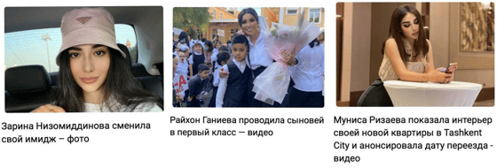 «Лайфстайл» пишет на самые разные темы. Мы выпускаем подборки, эксклюзивные интервью и, собственно, сами новости. Кстати, часть контента публикуется только у нас в Instagram (так что подписывайтесь). Но за несколько месяцев, изучив статистику, мы поняли, что абсолютно все новости, в которых упоминаются Муниса Ризаева, Зарина Низомуддинова, Райхон или Лола набирают набирают тысячи просмотров. Конечно, ничего удивительного ведь они самые популярные звезды шоу-бизнеса в нашей стране. Вот, к примеру небольшая подборка из топовых новостей на нашем сайте: