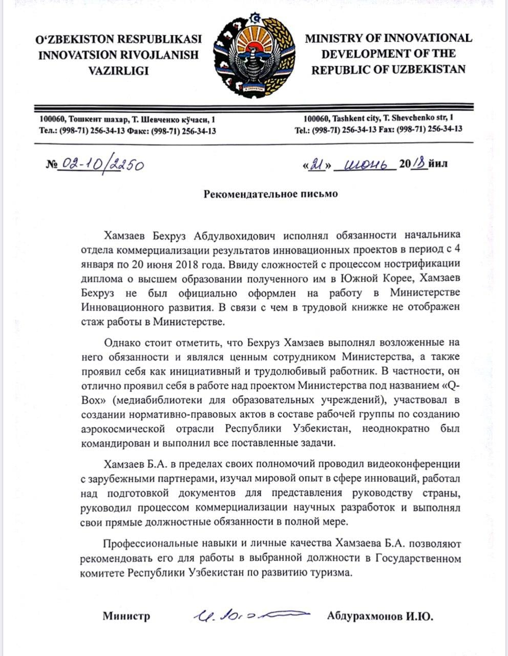 В ответ на заявление о том, что Хамзаев якобы не работал, Бехруз приложил рекомендательное письмо, которое подписал действующий министр инноваций И. Абдурахманов.