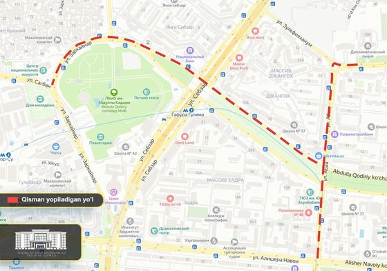 — на улице Абдуллы Кадыри — от ул. Абая до кругового движения на пересечении улиц Заркайнар и Сагбан.