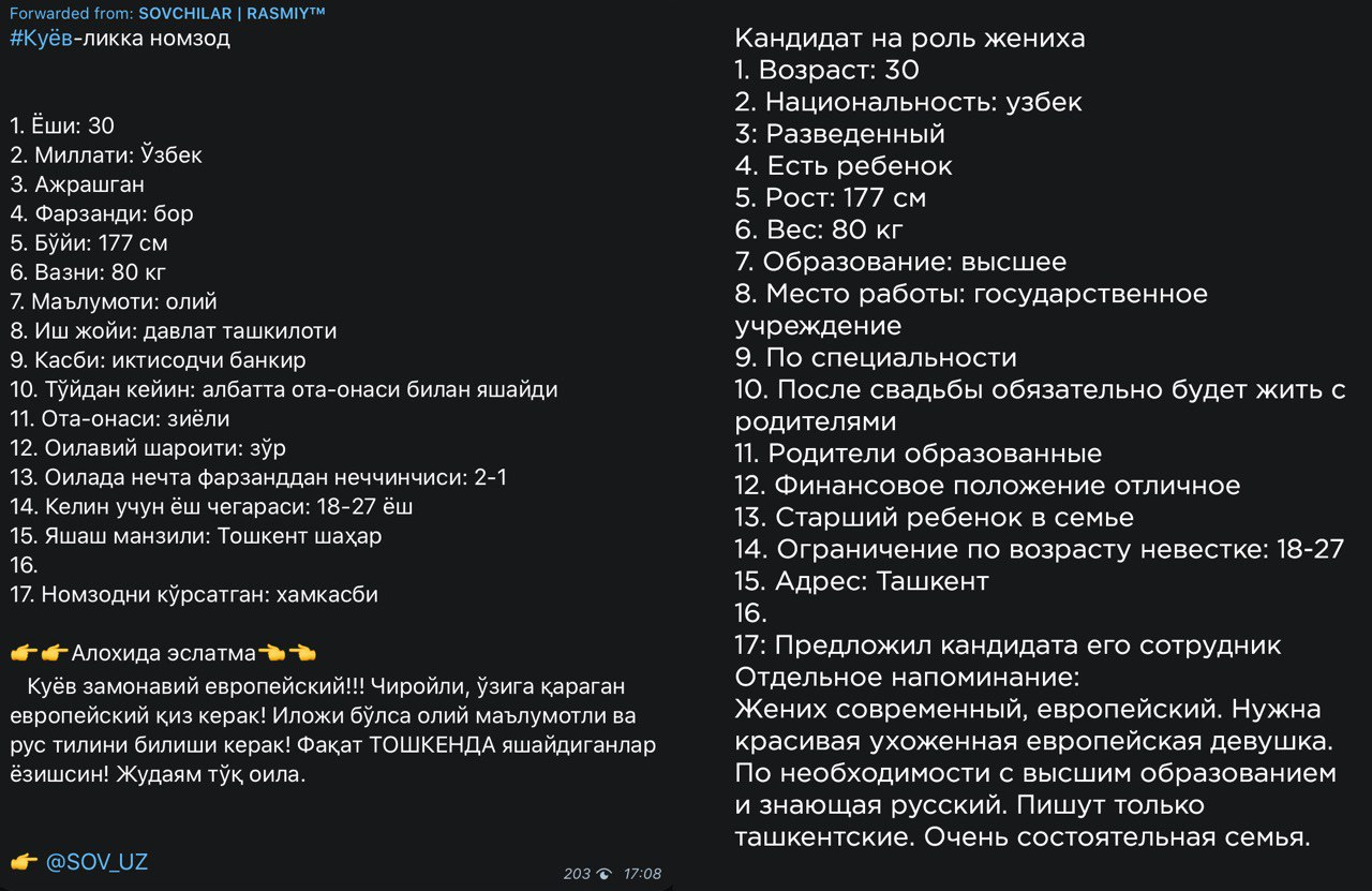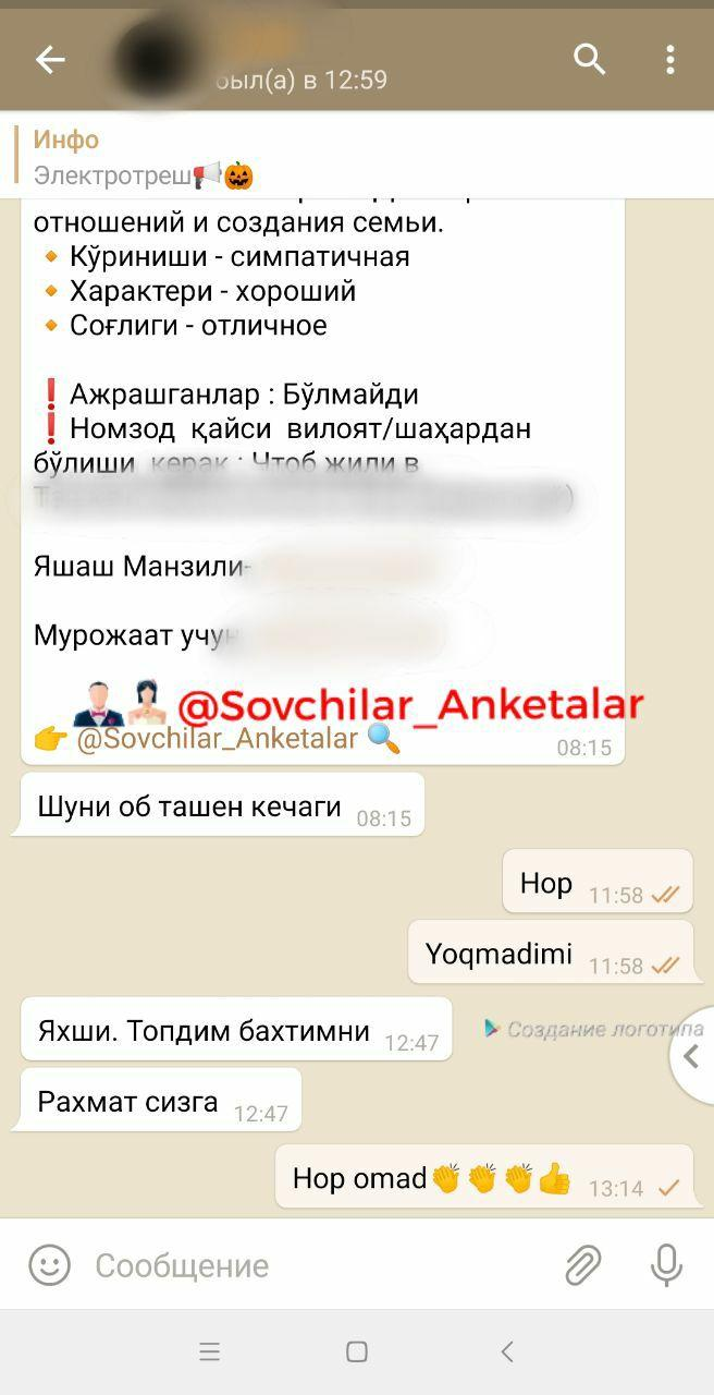 Telegram-каналы сегодня не просто способ коммуникации, но и площадка, где вы можете найти практически все, что угодно, в том числе и свою любовь. На канале Sovchilar-Anketalar более 273 тысяч подписчиков. Одинокие сердца или их родители размещают небольшую анкету, в которой указаны все необходимые данные кандидата: от роста и веса, до состояния семьи и образования родителей.