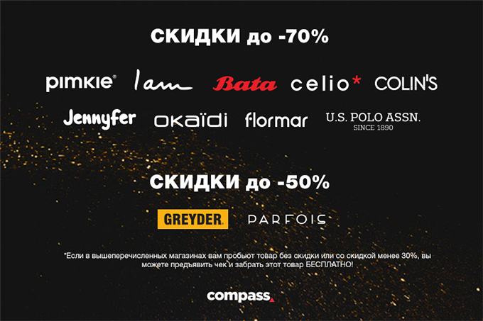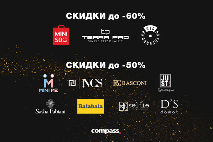Всех посетителей ТРЦ Compass ждут максимальные скидки и выгодные предложения от любимых брендов.