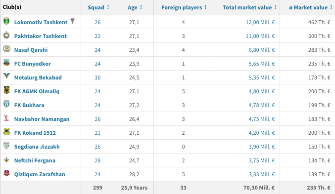 Ресурс Transfermarkt опубликовал стоимость футбольных клубов Pepsi Суперлиги Узбекистана. Согласно приведенным данным, самым дорогим клубом чемпионата 2018 года является столичный "Локомотив", совокупную стоимость которого оценили в 12 миллионов евро. Следом идет Пахтакор с ценником в 11 миллионов евро. Замыкает список зарафшанский "Кызылкум", который оценили всего в 3,33 миллиона евро. Самым дорогим игроком столичного "Локомотива" является Сардор Рашидов с ценником в 1,5 миллиона евро.